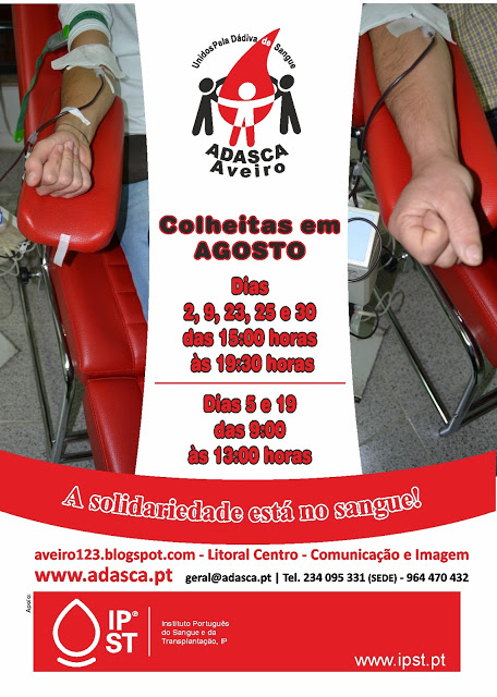 Para o mês de Agosto vão decorrer colheitas de sangue nos dias 2, 9, 23, 25 e 30 entre as 15 horas e as 19,30 horas, ainda nos dias 5 9 e 19 horas no Posto Fixo localizado no Mercado Municipal de Santiago, 1º. Piso em Aveiro. todas no Posto Fixo da ADASCA.