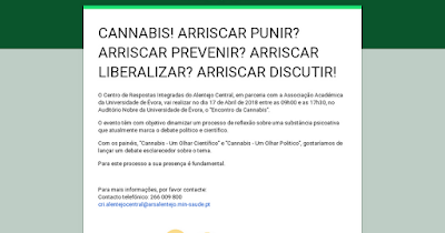 O Centro de Respostas Integradas do Alentejo Central, em parceria com a Associação Académica da Universidade de Évora, vai realizar no dia 17 de Abril de 2018 entre as 09h00 e as 17h30, no Auditório Nobre da Universidade de Évora, o “Encontro da Cannabis”.