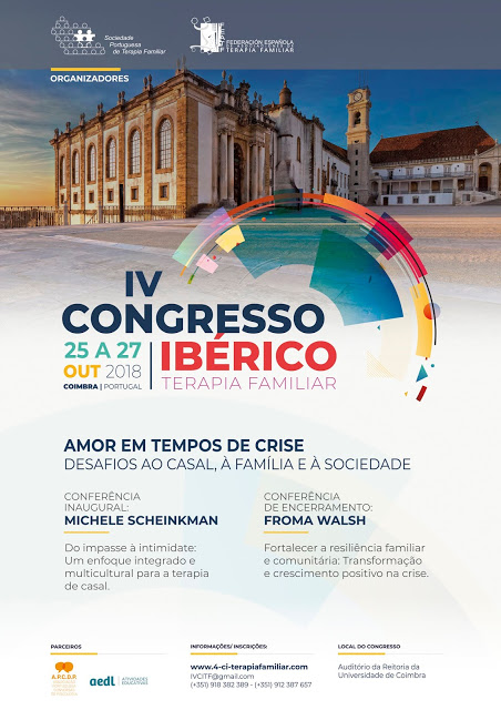 De 25 a 27 de Outubro, no Auditório da Reitoria da Universidade de Coimbra, vai ter lugar o IV – Congresso Ibérico – Terapia Familiar, este ano subordinado ao tema “Amor em tempos de Crise – Desafios ao Casal, À Família e à Sociedade”.