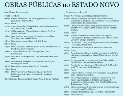 A tarde do primeiro dia do colóquio é dedicada aos temas “Obras públicas e ‘melhoramentos’ locais: entre Lisboa e o País (real)” (por Ricardo Agarez); “A ordem identitária das obras públicas” (por Nuno Rosmaninho); “Mobiliário e obras públicas” (por João Paulo Martins e Sofia Diniz); “Monumentos Nacionais: a construção de um legado” (por Luís Miguel Correia); “O Livro de Ouro da Exposição 15 Anos de Obras Públicas: arquitetura e propaganda” (por Margarida Acciaiuoli). A moderação do debate desta tarde é assegurada por Sergio Fernandez.