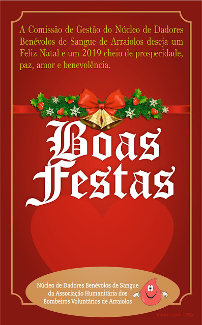 A Comissão de Gestão do Núcleo de Dadores Benévolos de Sangue da Associação Humanitária dos Bombeiros Voluntários de Arraiolos vem desejar-lhe um Santo e Feliz Natal e um 2019 cheio de prosperidade, paz, amor e benevolência.