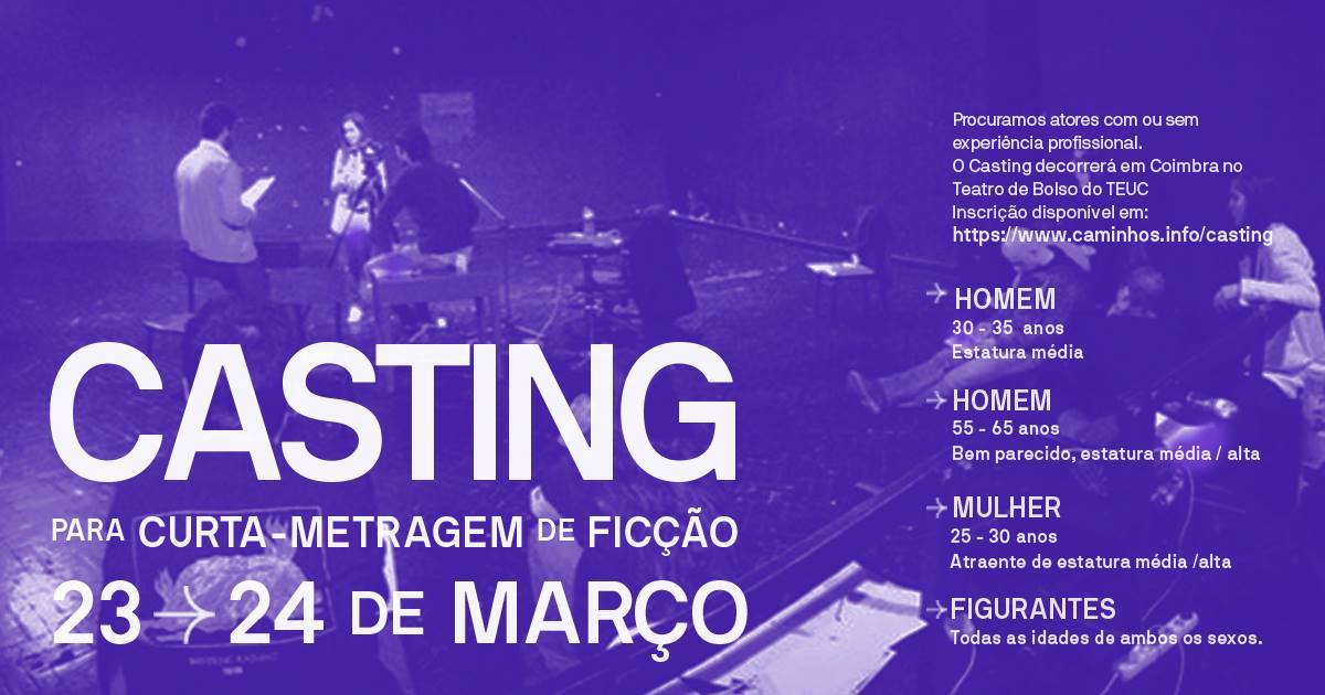 A Produçâo do filme decorrerá entre os dias, 13 e 17 de Abril, na cidade de Coimbra. A Participaç?o neste projeto n?o é remunerada e a inscrição – disponível em https://www.caminhos.info/casting – é obrigatória.