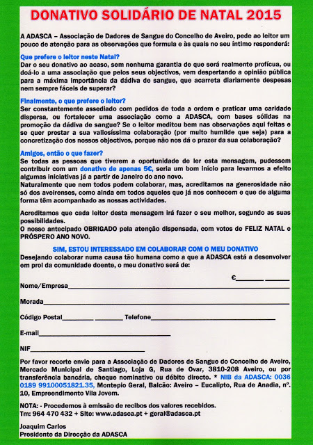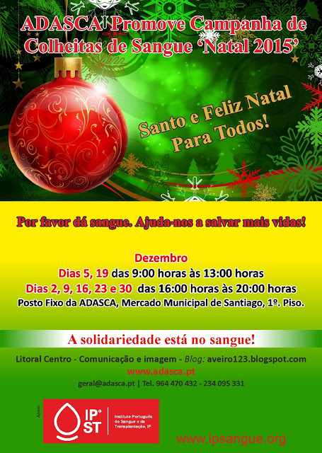 DEZEMBRO + SOLIDÁRIO = Sessões de Colheitas de Sangue no Posto Fixo da ADASCA em Aveiro