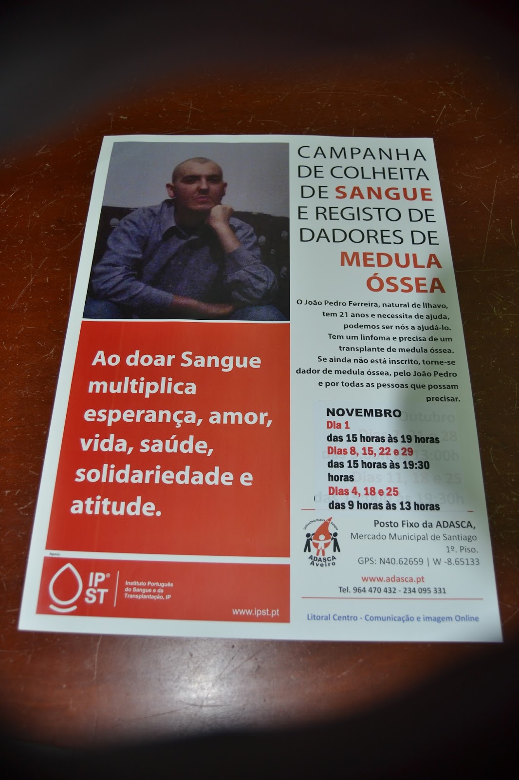 Colheita de sangue dia 4 de Novembro entre as 9 horas e as 193 horas no Posto Fixo da ADASCA em Aveiro