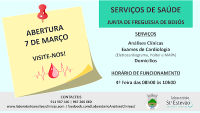 A partir do dia 7 de março, os fregueses podem realizar as respetivas análises e exames de cardiologia na sede da respetiva autarquia.
