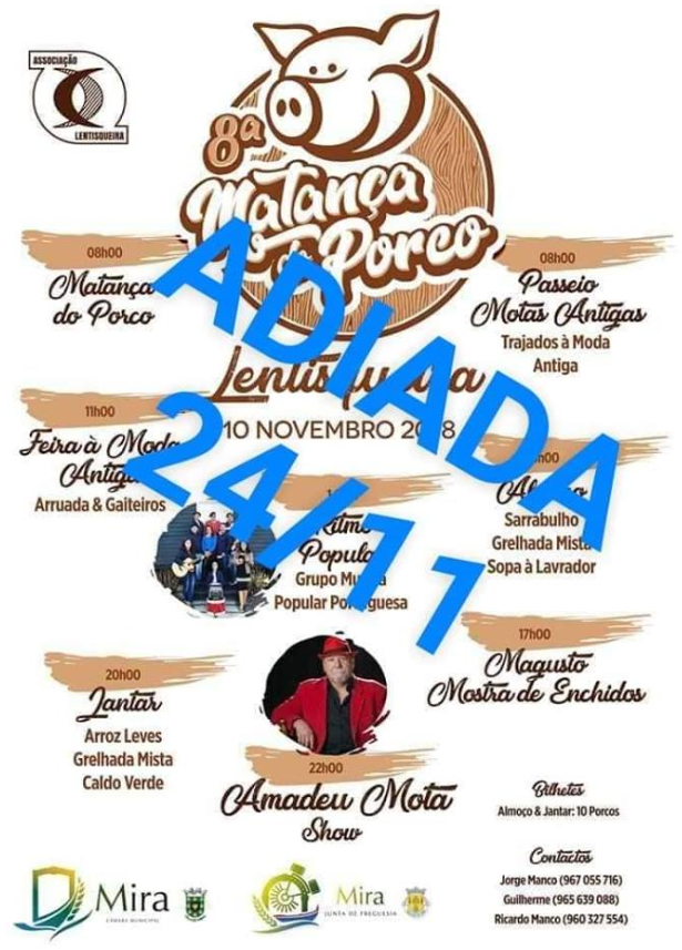 Uma vez que estão previstas, para o próximo fim de semana, condições meteorológicas adversas, com muita chuva, informa-se que a 8ª Matança do Porco foi ADIADA para o próximo DIA 24 de NOVEMBRO.